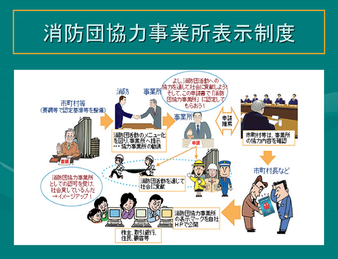 「消防団協力事業所表示制度」とは、事業所の消防団活動への協力が社会貢献として広く認められると同時に、事業所の協力を通じて、地域防災体制がより一層充実されることを目的とした制度です。