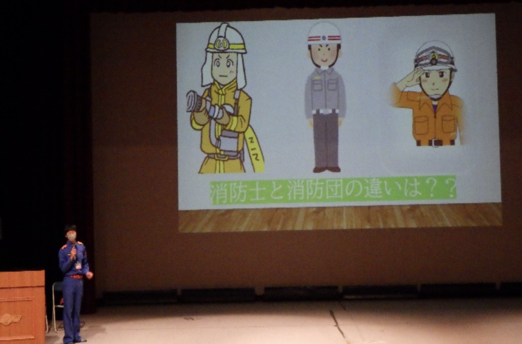 消防団とは何かからスタートし、県消防操法大会の動画での女性消防団員の活躍も含め、クイズも交えながら、興味を持ったら是非問い合わせてほしいと締めくくりました。
