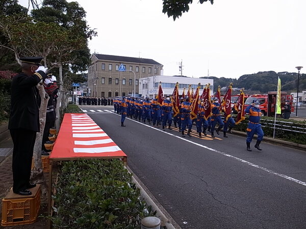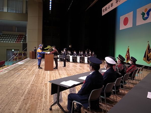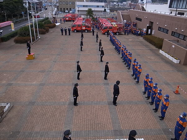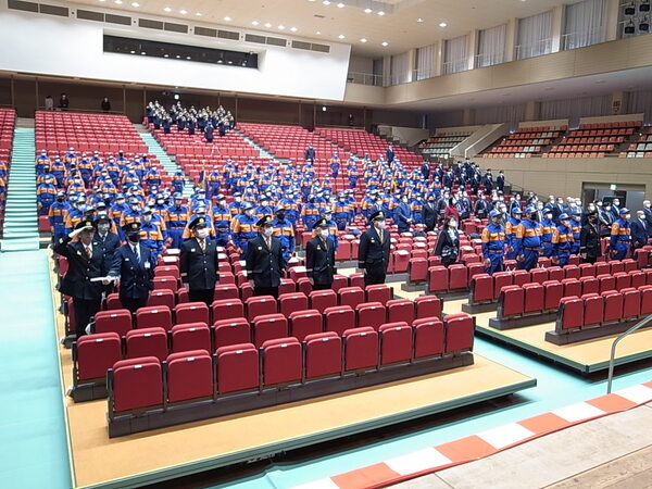 令和4年1月5日、平戸文化センターにて、平戸市消防出初式を開催されました。 今年も新型コロナウイルス感染防止のため、規模を縮小し、約350人の消防団員や関係者らが参加し、ラッパ隊の演奏による団員の分列行進を行い、防火、防災への決意を新たにした。 式典では、各種表彰が行われ、また、団長訓辞では、「消防団員は、地域防災の要であり、決意を新たに一層の努力と精進を期待する。」と述べた。式典後は、消防団員による消防車両市内パレード、平戸港に向けて放水演習を行うなど団員の士気を高めた。 また、今年度は、消防団員の活動服を、夜間活動時の視認性の向上を図った新基準活動服に一新し、新たな気持ちで出初式が執り行われた。