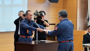 今回の辞令交付では、副団長へ昇格された3名をはじめ、各分団において階級が昇格された方、計110名へ島原市消防団長より辞令を交付しました。