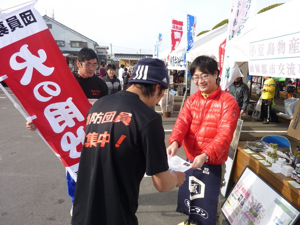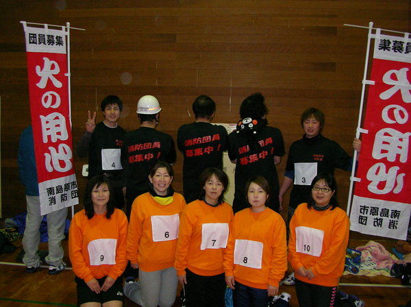 南島原市では、平成23年度消防団員確保対策推進事業補助金の助成を受け、「消防団員募集」Tシャツを作成しました。 そのTシャツを着て、昨年度作成したのぼりとともに、2月12日に開催された 「南島原市綱引き大会」、そして2月26日に開催された「南島原市原城マラソン大会」で消防団チームが参加しました。また会場では、参加募集チラシも配布し広く団員募集を呼びかけました