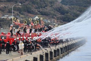 また、観閲・市中行進では東彼杵郡3町の消防団員が力強く堂々と行進を行い、一斉放水では、一斉に空高く放水されると、集まった多くの来場者から拍手や大きな歓声があがっていました。