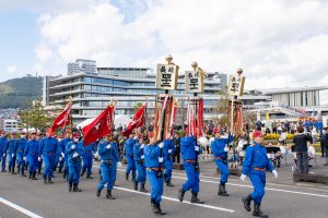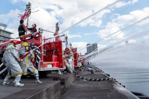 フィナーレでは、消防団の車両16台と消防艇3隻が一斉放水を行い、長崎市消防団として防火への思いを新たにしました。