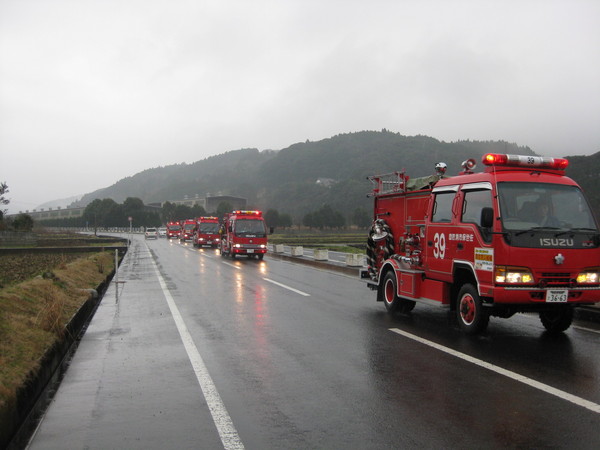 佐世保市消防団は、佐世保市北部地区を管轄する世知原、吉井、小佐々、江迎、鹿町の消防団が火災予防広報を行うために、防火パレードを実施しました。世知原町をスタートし各町経由で小佐々町まで総距離にして約30km程度を消防団車両10台前後でサイレン吹鳴しながらの広報パレードです。かなり勇壮なものです。あいにくの雨でしたが市民には消防団の心意気が伝わったと確信してます!