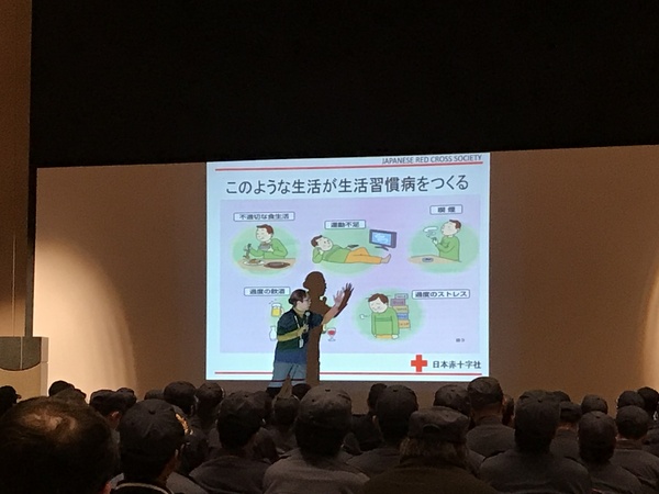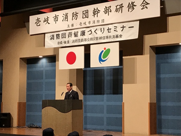 平成30年1月27日(土)、壱岐の島ホール中ホールにおいて壱岐市消防団主催で壱岐市消防団幹部研修会を実施しました。研修会には、日本赤十字社長崎支部より樺山智子氏を招聘し、樺山講師からは「生活習慣病予防講座」という演題で壱岐市における生活習慣病の現状や、その予防対策についてご講演いただきました。