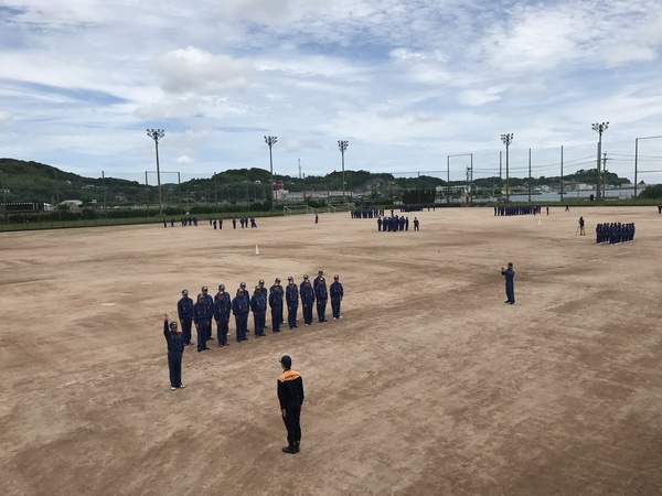 平成29年7月2日(日)、壱岐市芦辺町ふれあいグラウンドにおいて現地教養訓練を実施しました。現地教養訓練は、操法大会が開催されない年(隔年)に実施しています。訓練礼式担当として長崎県消防学校より上戸教官、ラッパ隊教習担当として陸上自衛隊大村駐屯地より黒木教官、谷村教官を招聘し、壱岐市消防団員560名が訓練に参加しました。当日は梅雨の晴れ間により、非常に蒸し暑い中、終始集中を切らさず熱心に訓練に励みました。