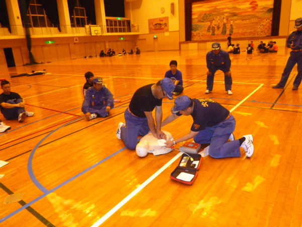 平成25年6月から7月にかけて、対馬市消防団厳原地区消防団による夏季訓練として、普通救命講習が実施されました。 対馬市消防署の職員を講師として招き、心肺蘇生法やAEDの取扱、各種応急手当を3時間という長い時間の中でしっかり学び、「いつ、どこで、だれに」起こるか分からない緊急の事態に即座に対応できる能力を身につけました。また、受講が終了した全員に修了証が交付されました。 講習の中では、団員による活発な意見交換や質問がされ有意義な講習になりました。