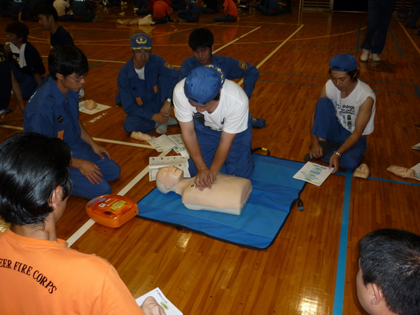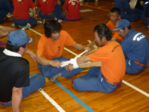佐々町消防団では、7月9日(金)、夏季訓練を実施しました。 訓練には、約80名の団員が参加し、AED(自動体外式除細動器)の使用方法や、段ボールや新聞など身の回りにあるものを使用した負傷者の応急処置、止血の方法などを学びました。