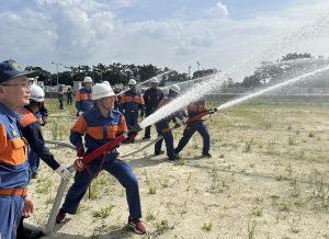 午前の部の訓練では、屋内で「消防団の身分、仕事、処遇」や「火災現場と安全管理」などの教養を学びました。また、午後の部からは屋外に出て、昇任幹部科訓練では礼式や車両の取り扱い訓練などを、初任科訓練では礼式やホース取り扱いおよび放水訓練といった消防活動の基本を、大村消防署の隊員の指導のもと学びました。