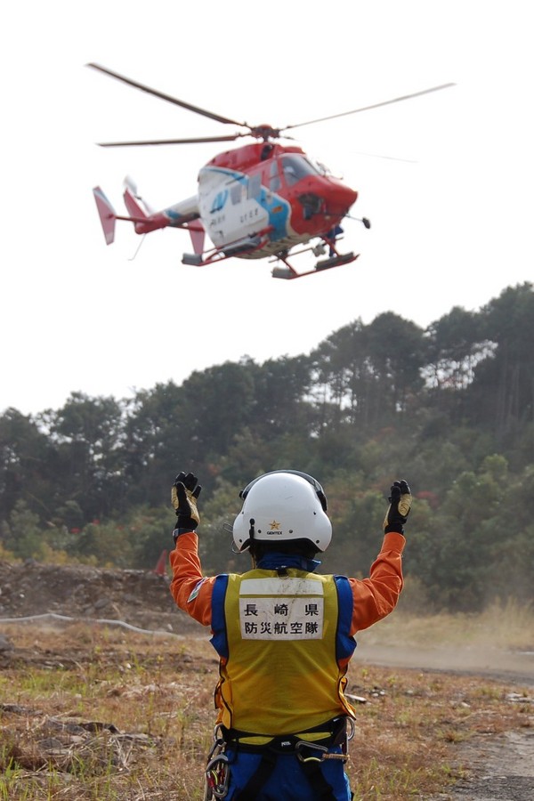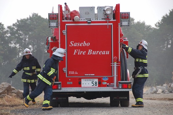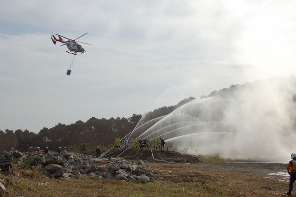 11月14日、西彼町八木原郷ハウステンボスカントリークラブ近くで、西海市消防団、佐世保市消防局、佐世保市消防団による「消防相互応援協定事務連絡会消防応援出動訓練」が実施されました。 午前10時、林野火災を想定して訓練開始。119番通報後、佐世保市消防局西彼出張所のポンプ車が到着し、消火活動開始。 火災延焼拡大と想定し、第2出動指令で、西彼方面団が出動。水利から数台のポンプを中継して放水。 その間に、県の防災ヘリが到着。総監の田中市長を乗せ上空から偵察し、佐世保市消防団へ出動要請。 要請に応じた佐世保市消防団の第2・3分団が現場に到着。 計6線の放水と、防災ヘリからのバケット放水により火災鎮火。 ケガ人やトラブルも無く無事に訓練は終了しました。