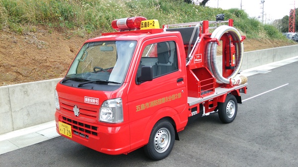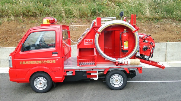 一般社団法人日本損害保険協会より五島市消防団へ「小型動力ポンプ付軽消防自動車」が寄贈されました。 日本損害保険協会では、全国の消防力の強化・拡充に協力するために、昭和57年から軽消防自動車などの寄贈をおこなっており、今年度は全国19市区町村および離島7市町村に26台が寄贈されました。 この車両は、第8分団2部大開分駐(久賀島地区)に配備しました。