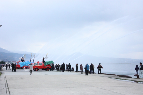 1月5日(火)、東彼杵町総合会館文化ホールにおいて消防出初式を開催しました。 表彰等式典を文化ホールで執り行った後、屋外にて観閲服装点検・機械器具点検を行いました。 それから、放水場所まで市中を行進し、最後は1年間の無火災を願い、全消防車による一斉放水で幕を閉じました。