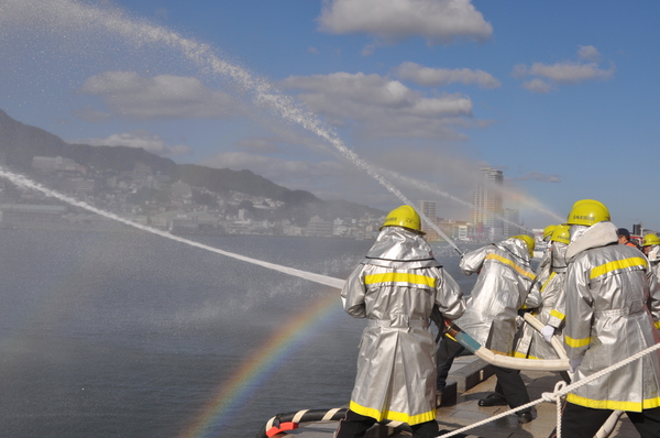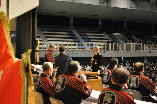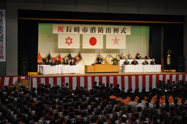 平成27年1月7日、長崎市消防団をはじめ、婦人防火クラブなどの市民防火組織約3,000人が参加し、年頭を飾る恒例の「長崎市消防出初式」が開催されました。式典では、長崎市消防団に対し消防団員の確保を通した地域防災体制の充実などの功績を讃え、長崎県知事から感謝状が贈呈されました。 また、第2会場の水辺の森公園では、機械器具点検のほか、消防職・団員による勇壮な分列行進が行われ、最後に消防団車両32台による一斉放水が実施されました。