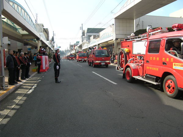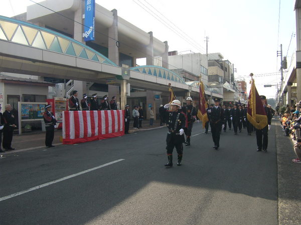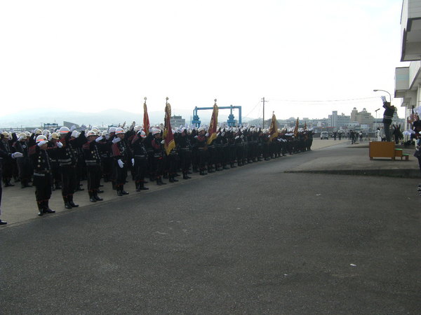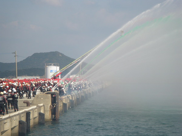 五島市池田町「福江文化会館」での式典終了後、ラッパ隊を先頭に、消防団員・幼年消防クラブ・婦人防火クラブ総勢800名による市中分列行進を行いました。観閲場所の商店街は、郷土を守る消防団員の堂々とした行進を見物する多くの市民で賑わいました。 福江港岸壁では、色とりどりの一斉放水を行い、一年間の無火災を願いました。