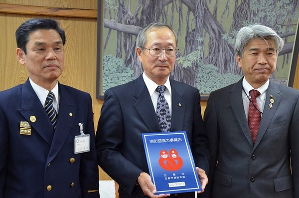 五島市では、平成25年1月4日に「消防団協力事業所表示制度」を導入し、平成25年3月28日第1号として、五島市吉田町の「こばた電設株式会社」様を認定いたしました。