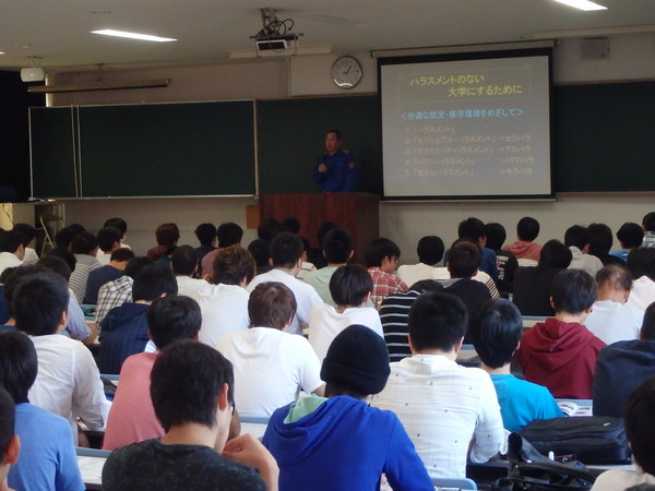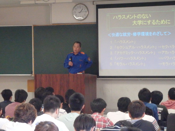 平成27年9月24日(木)に長崎総合科学大学にて、約150名の学生を対象に消防団活動の紹介や地元住民とのつながりの大切さなどについて、長崎市消防団の松竹副団長が講話を行いました。 全国的に消防団員が減少している中、若い人材の確保が必要であるため、次世代の担い手となる大学生に対して「地元を一緒に守りましょう!」と団員募集を呼びかけたところ、中には、ボランティア活動をしている学生もいて、講話を真剣に聞いていました。 学生の皆さん、一緒に消防団活動をしませんか!