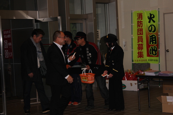 五島市消防団は、12月14日福江文化会館において開催された「愛のチャリティ歌の祭典」に出場しました。 会場受付では、「団員募集」啓発のポケットティッシュを来場者へ配布しました。また、ステージでは、消防団員が整列し「団員募集」と「年末年始の火の用心」を呼びかけました。