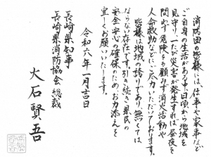 令和6年1月吉日、大石賢吾長崎県知事から、日常から地域防災力の要として尽力していただいている消防団員の皆様方に対し、直筆の感謝のメッセージが送られました。