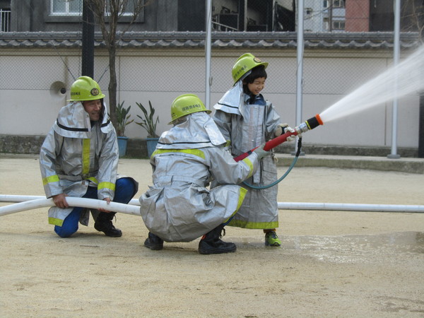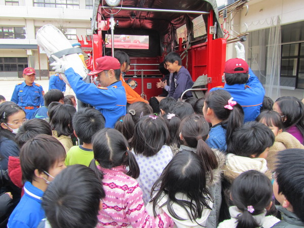 平成26年2月4日(火)に長崎市消防団第6分団が長崎私立桜町小学校を訪問しました。  当日は、前日の気温より10度以上低くとても寒い日でしたが、3年生の児童はとても元気よく消防団の方に質問したり、消防ホースや筒先など普段触ることのできない資機材に触れとても勉強になった様子でした。  最後に放水体験を行い、気分は「消防団員」といった様子でした。  写真は、訪問時の様子です。