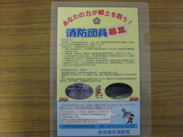 平成23年度佐世保市消防団員確保対策推進事業として、長崎県消防団員確保対策推進事業費補助金を活用し、「あなたの力を郷土のために!」をスローガンに物品購入を行いました。 1 団員募集横断幕・・・各中隊の繁華街を中心に掲出しました。 2 広報用マグネットシート・・・全消防団車両に貼付しました。 3 団員募集オリジナルクリアファイル・・・市内各支所・行政センター窓口に配置しました。 今回の事業を契機に、消防団員の確保に全力を挙げているところです。 また、佐世保市においては、広報させぼ1月号に消防団特集を掲載し、市民から「今まで知らなかった消防団のことがよく理解でき、がんばっていただきたい。」という多数の言葉をいただいたところです。さらに2月1日からは、消防団協力事業所表示制度と佐世保市契約管理室における事業所加点制度をタイアップし、協力事業所の拡大を図っております。