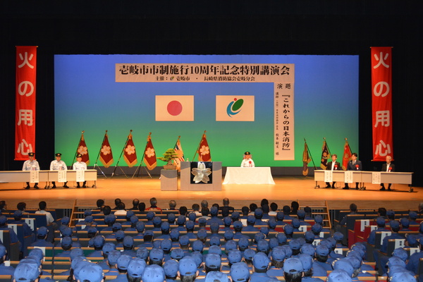 平成26年7月6日(日)午前10時〜12時まで壱岐市郷ノ浦町の壱岐文化ホールにおいて、平成16年3月1日、合併により壱岐市が誕生し、10周年を迎え、特別講演を実施しました。  講師は、公益財団法人日本消防協会長の秋本敏文様をお招き、来賓に長崎県知事、公益財団法人長崎県消防協会長にご参加いただき、対象者約600名が集まり盛会裏に終了しました。  演題は、『これからの日本消防』について、先般施行された消防団を中核とした地域防災力の充実強化に関する法律を中心とした内容であり、消防団に限らず、一般の方々にもわかりやすい講義を頂きました。
